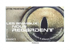 Ausgabe Briefmarken mit Augen. Eine zeigt das Auge von einem Weißspitzen-Riffhai (Triaenodon obesus). Es handelt sich um einen mittelgroßen Hai mit einer durchschnittlichen Körperlänge von ca. 1,50 Meter.